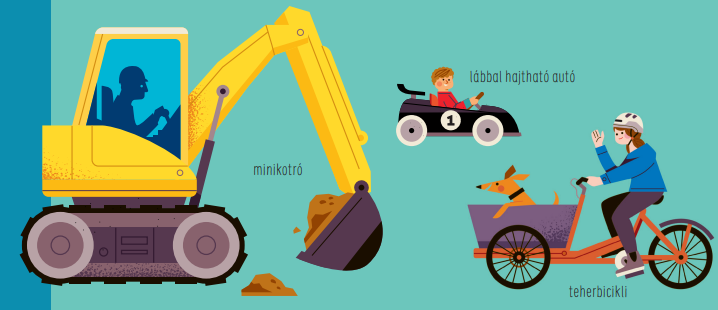 Ebben annyi beszélgetési lehetőség, mese, kultúra, ötlet, poén van, olyan sok szempont alapján lehet ezeket csoportosítani (erre egyébként a rövid, korrekt és gördülékeny szöveg is buzdít), hogy simán elővettem volna a védőnő várótermében, és nyelvet öltöttem volna (puszta irigységből) a mondókázó anyukákra. A többi oldalpárra sem lehet panasz: látunk itt mindent, ami úszik (búvárt is), a gazdaság járműveit (burgonya-betakarító gép! Mint egy verssor…), a városi közlekedés eszközeit (fagylaltos kocsival szeretnék munkába járni), az építkezések dinoszauruszait (bocsánat, munkagépeit), mindent, ami szirénázik (szerencsére a könyv csendben maradt), egy oldalpárnyi izét, ami valahogy megy (hippi busz, tuk-tuk, ufo), leg-leg-legnagyobb mindenféléket, és mini verdákat (húzható kiskocsit polippal). Meg még két oldalon mindent, ami kimaradt (tengeralattjárót polippal). Mondanom sem kell, hogy a rajzok viccesek és kedvesek.