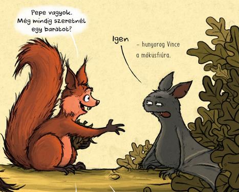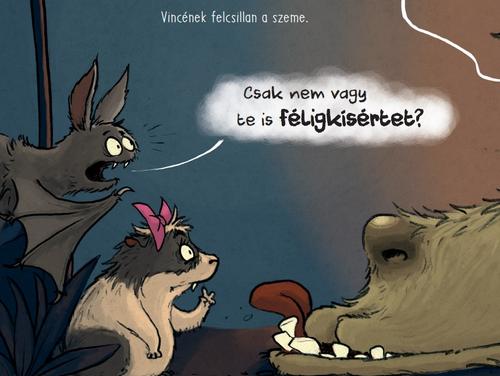 Ám a szöveg szinte háttérbe szorul a képek mellett. Vince karaktere szuper aranyos, olyan szerencsétlen és szánni való arckifejezéseket tud vágni, hogy az ember vigasztalón megcirógatja a lapokat. A tördelés átmenetet képez a folyó szöveg és a képregény szövegbuborékjai között, pár oldal után megszokható és jól követhető.