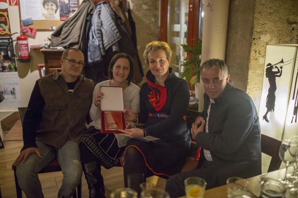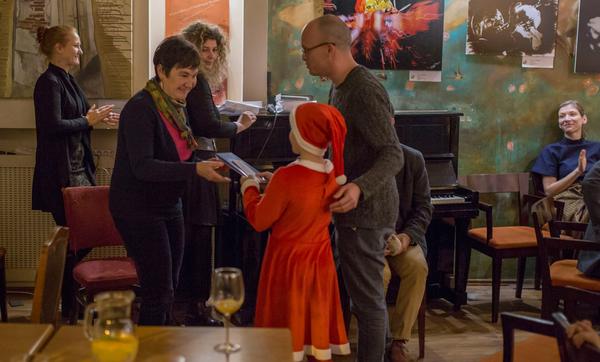 Fráter Erzsébet a Scolar Kiadó hagyományos karácsonyi ünnepségén, a korábban díjazott Gerlóczy Mártontól vette át az Év Könyve Díjjal járó látványos üvegplakettet, valamint a díj támogatói, így a Városliget Zrt., a Magyar Nemzeti Filharmonikus Zenekar, Énekkar és Kottatár Nonprofit Kft., a Trófea Grill Étterem Újbuda és a Katona József Színház további ajándékait.